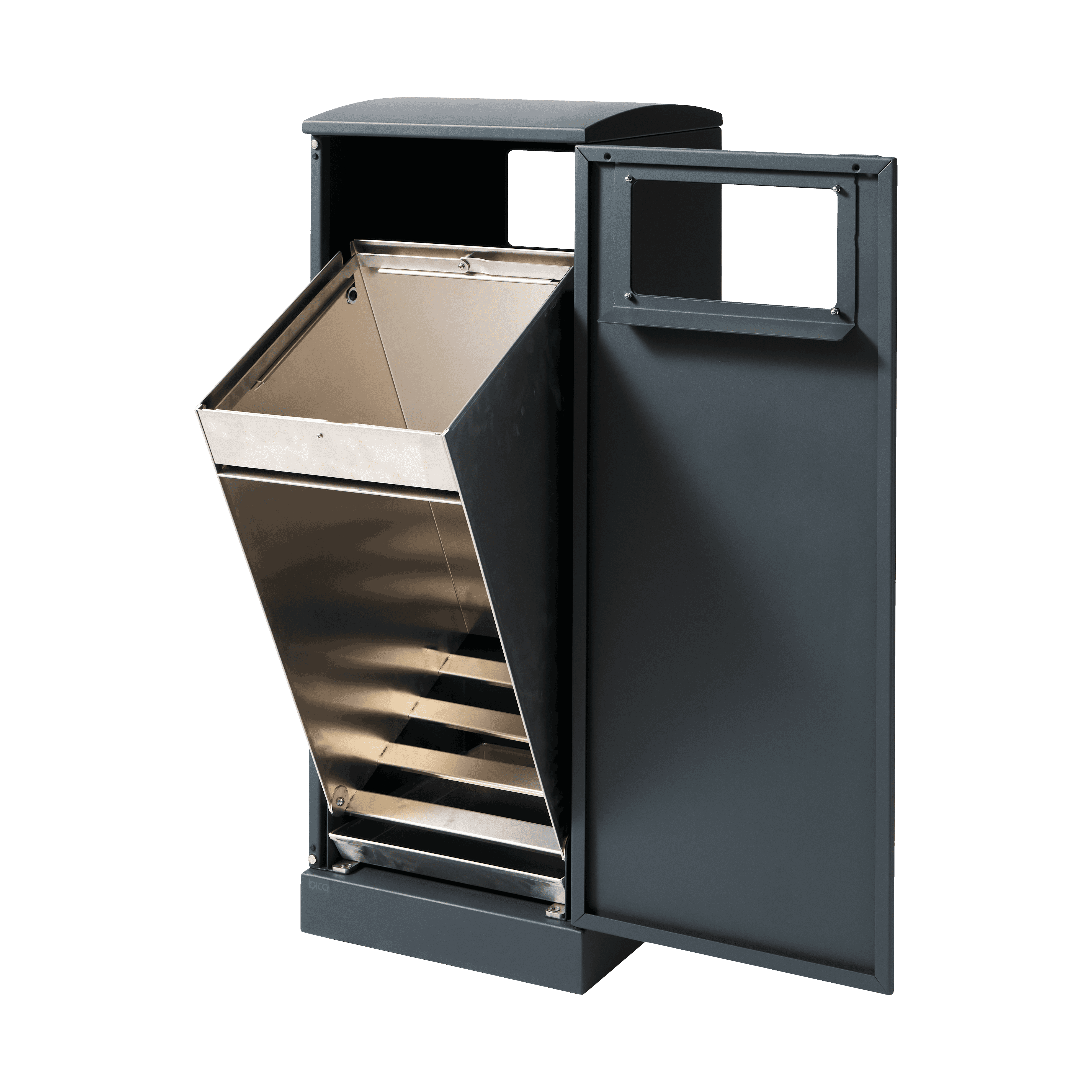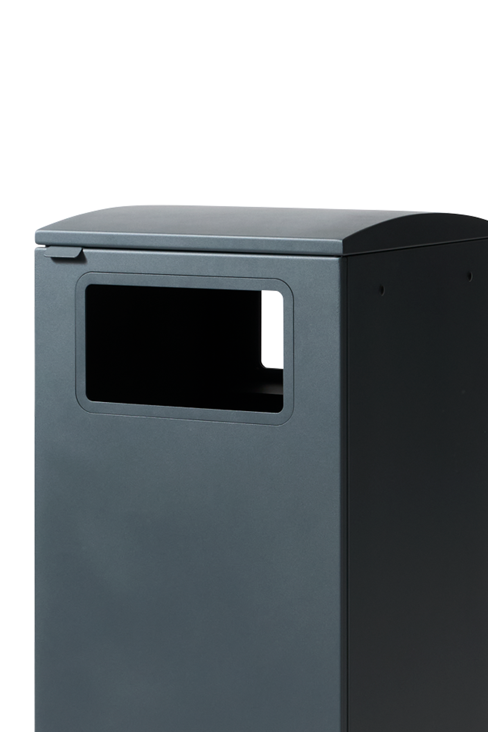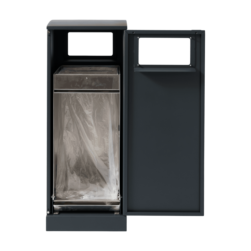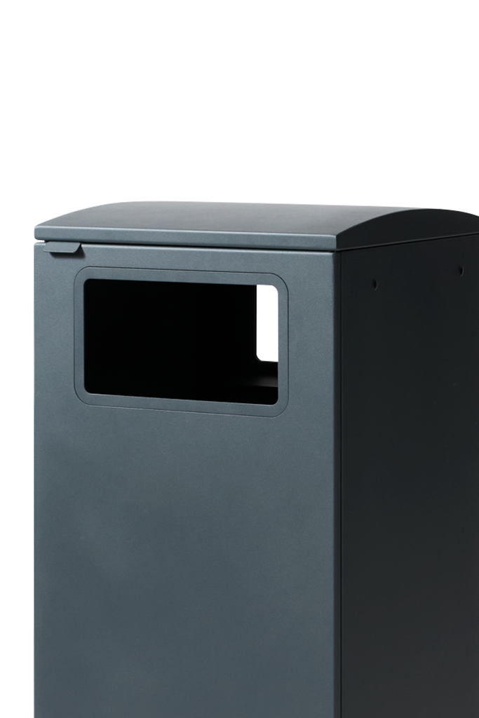 För att uppnå en stilren design, lång livslängd och minimalt underhåll är avfallsbehållaren gjord av pulverlackerat stål. De rena linjerna i designen gör den till en avfallsbehållare som naturligt kan vara en del av inredningen. Inga synliga fötter och gångjärn säkerställer en minimalistisk och elegant look.