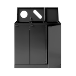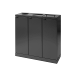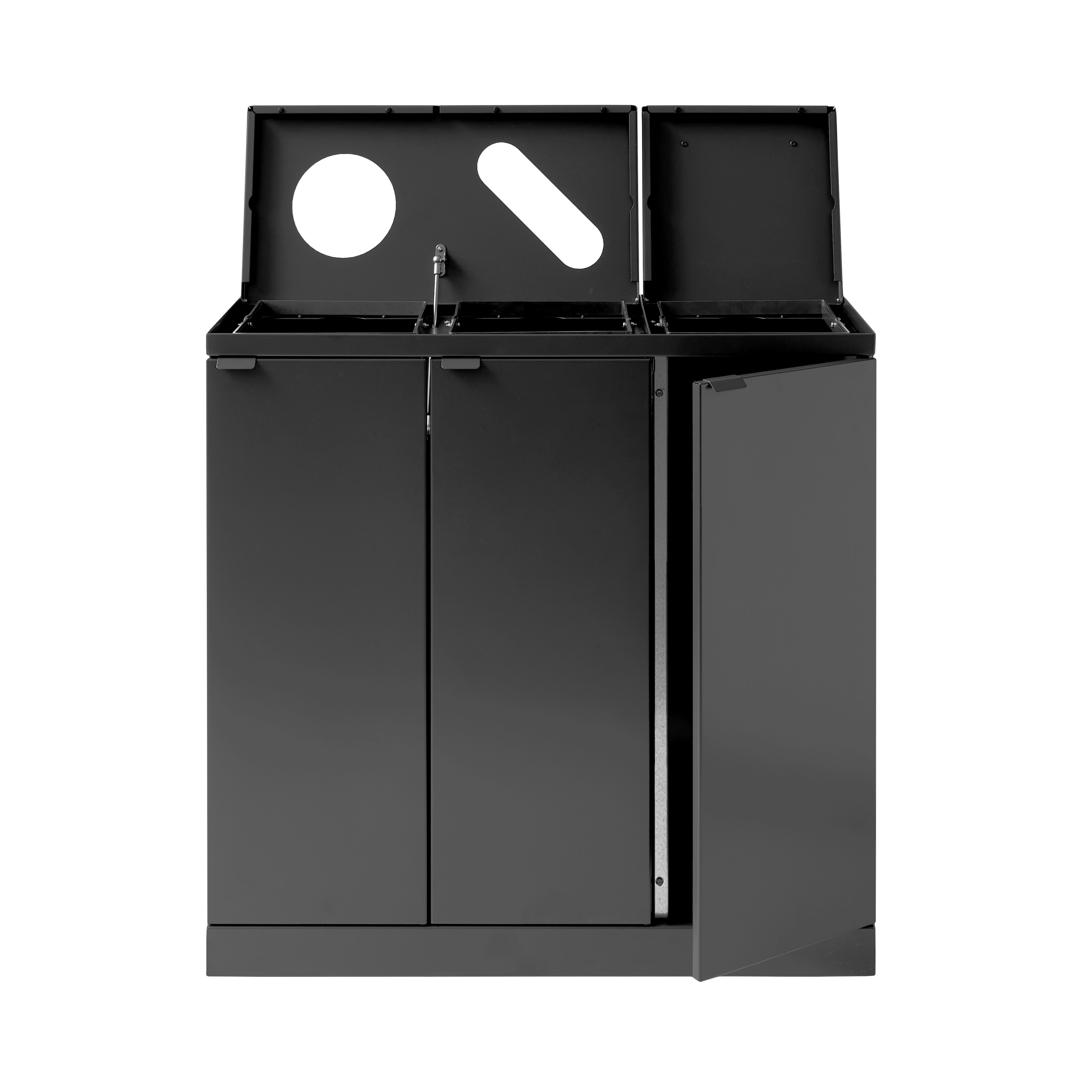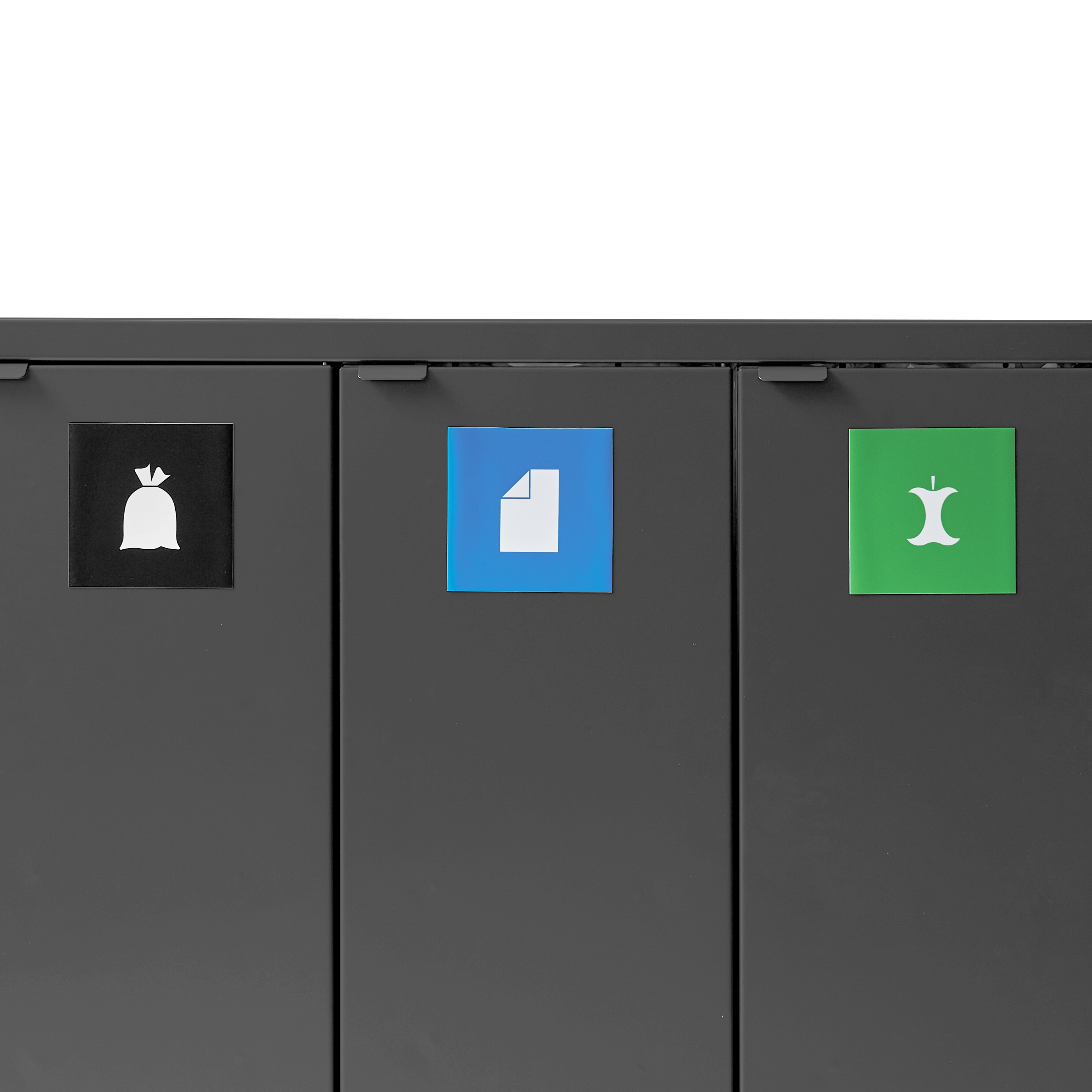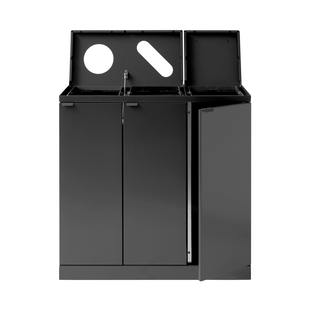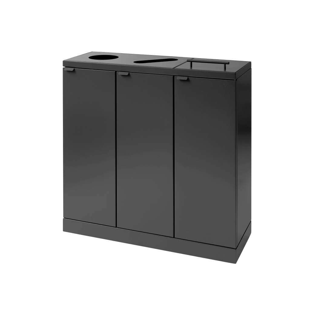 Flexibelt avfallssystem från Bica säkerställer enkel och användarvänlig avfallssortering på arbetsplatsen. Avfallssystemet är utformat med 3 fraktioner: 2 öppna inkast och 1 med lyftbart lock. Syftet med locket är att minimera luktstörningar och förhindra bananflugor vid sortering av matavfall. En riktigt smart lösning om påsen inte töms särskilt ofta. Den ena runda insatsen är lämplig för flaskor/burkar och den andra är avlång för sortering av papper.