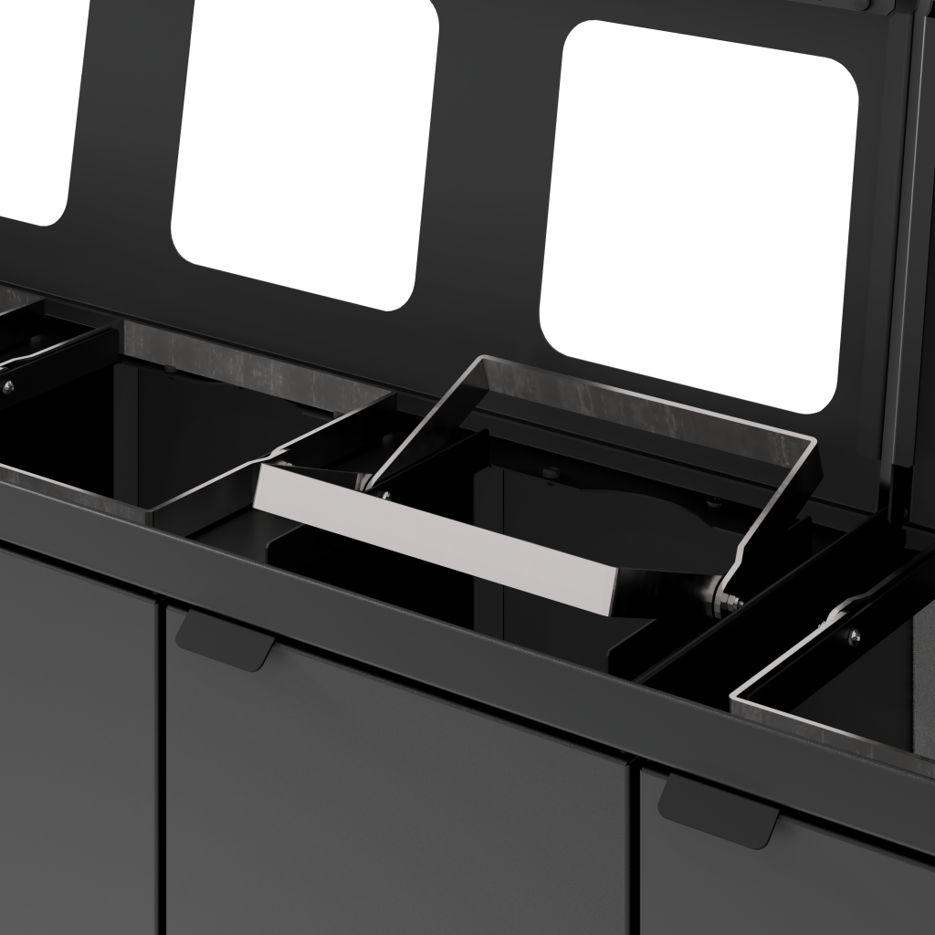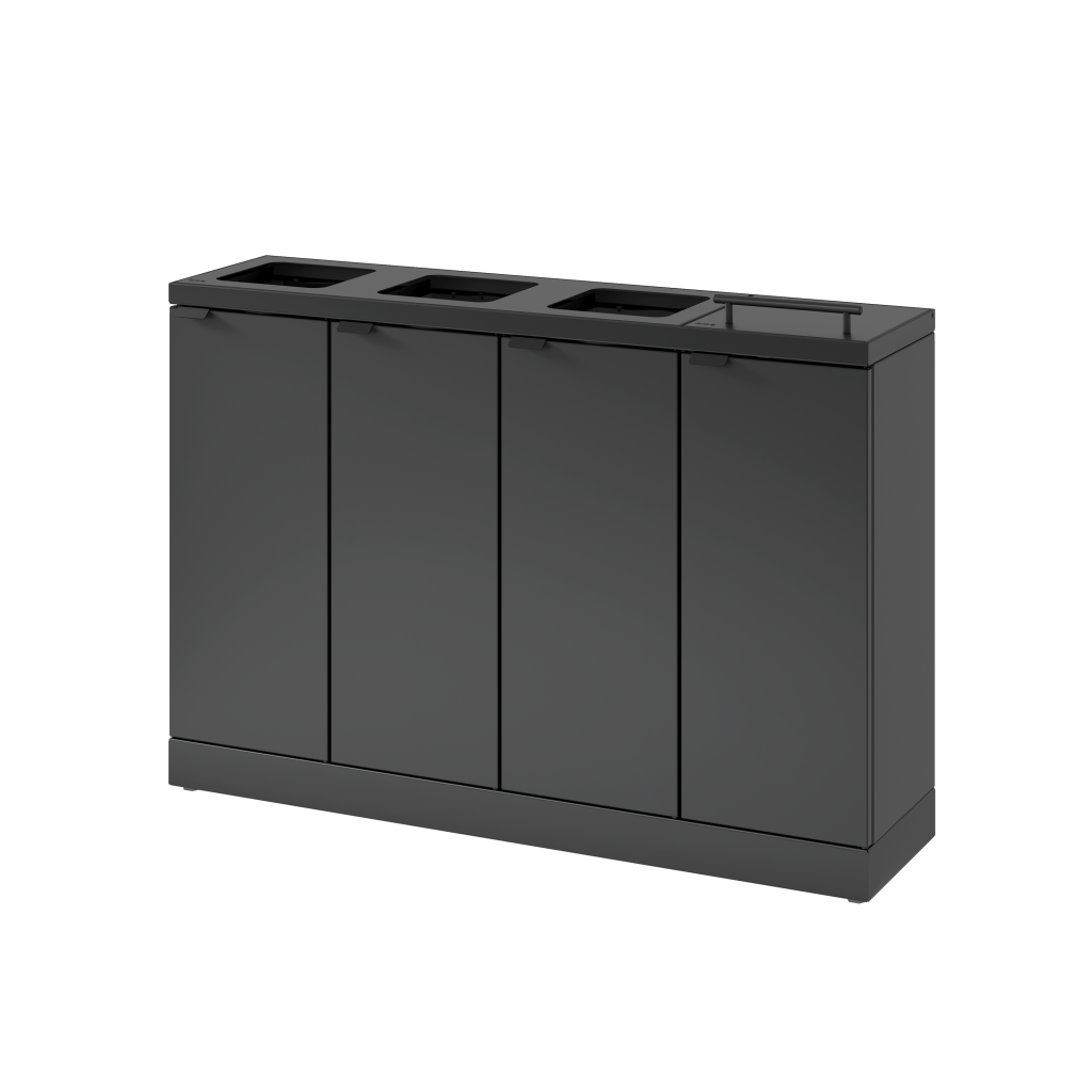 Flexibelt avfallssystem från Bica säkerställer enkel och användarvänlig sopsortering på arbetsplatsen. Avfallssystemet är utformat med 4 fraktioner, respektive 3 öppna inlopp och 1 med lyftlock. Syftet med locket är att minimera luktstörningar och förhindra bananflugor vid sortering av matavfall. En riktigt smart lösning om påsen inte töms särskilt ofta.