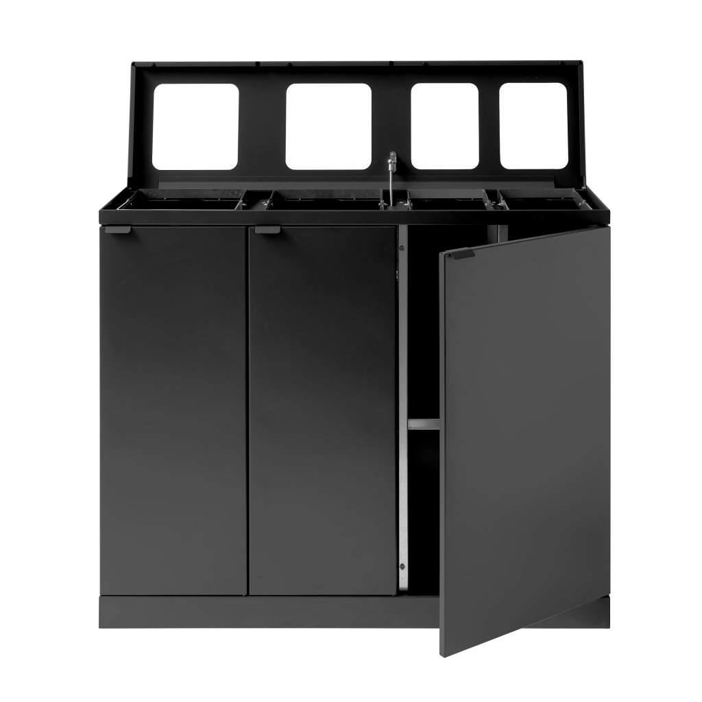 Källsorteringen är försett med frontdörrar med soft close för ergonomiskt korrekt tömning utan tunga lyft. Avfallssystemet är utrustat med integrerade och starka påshållare, så att påsen inte glider av. En gasdämpare är monterad i locket för ljudlös och lugn stängning. Locket döljer även påsarna så att avfallssystemet bibehåller en stilren design. Avfallssystemet är mobilt tack vare de monterade hjulen, som är gömda bakom sockeln. Avfallslösningen levereras med ett magnetiskt väggfäste som den ska fästas vid.