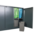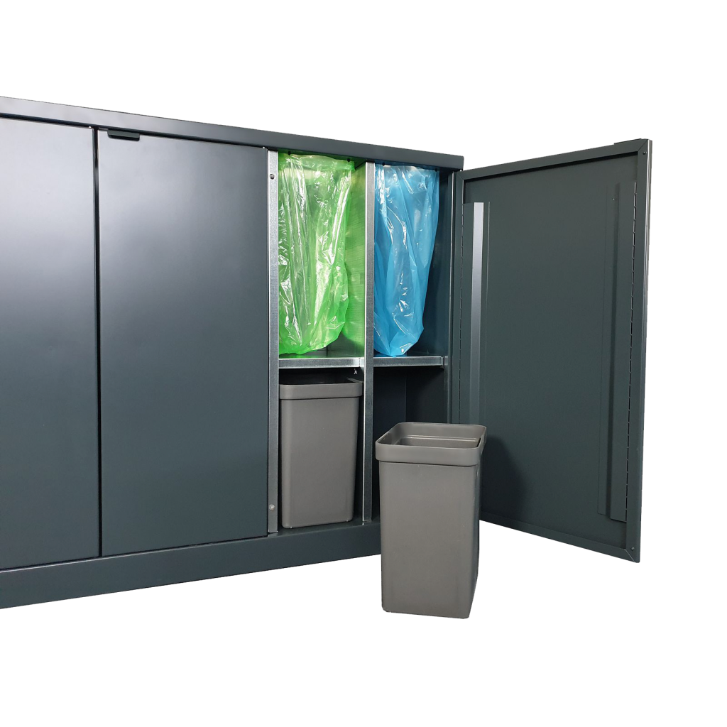 Flexibelt källsortering från Bica säkerställer enkel och användarvänlig avfallssortering på arbetsplatsen. Avfallssystemet tillåter differentierad volym i en integrerad lösning, vilket är praktiskt om du behöver sortera i olika mängder. Hyllor har installerats i fraktionen 2×45 liter, vilket gör det möjligt att sätta in innerbehållare för skarpt avfall, där påsen kan gå sönder.