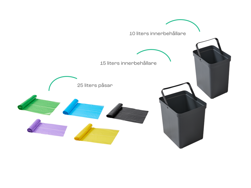 För innerbehållare med en kapacitet på 10 och 15 liter ska du använda påsar på 25 liter.