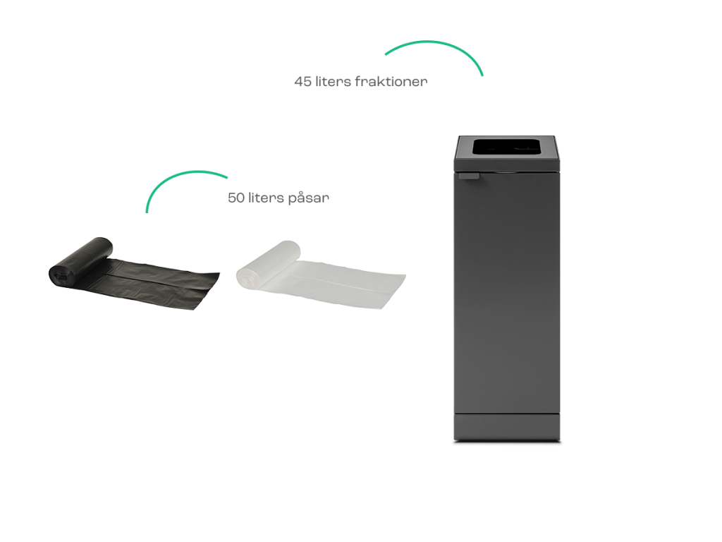 För alla fraktioner med en kapacitet på 45 liter ska du använda påsar på 50 liter.