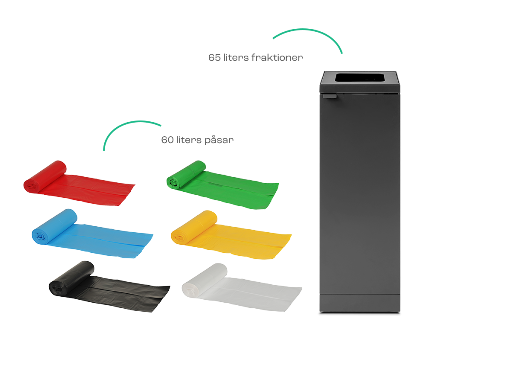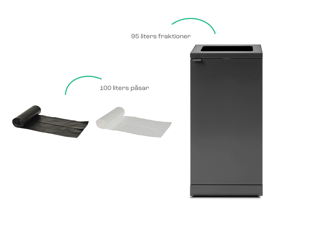 För alla fraktioner med en kapacitet på 95 liter ska du använda påsar på 100 liter.